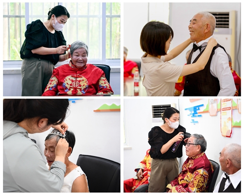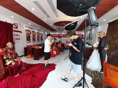 活動前夕,公司組織攝影團隊提前為張渡村里近百對金婚老人拍攝了婚紗照。第一次穿上“嫁衣”、對鏡梳妝,老人們面露羞澀,可臉上卻洋溢著幸福。在這些夫婦中,婚齡最大的86歲老人尤其寅和84歲老人張翠連已經相伴走過64年。